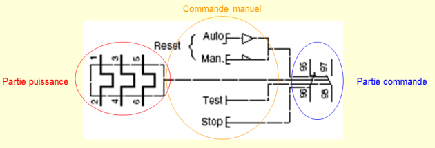 Le relais thermique coupera par le biais d'un contact auxiliaire l'alimentation du contacteur dans la partie commande.